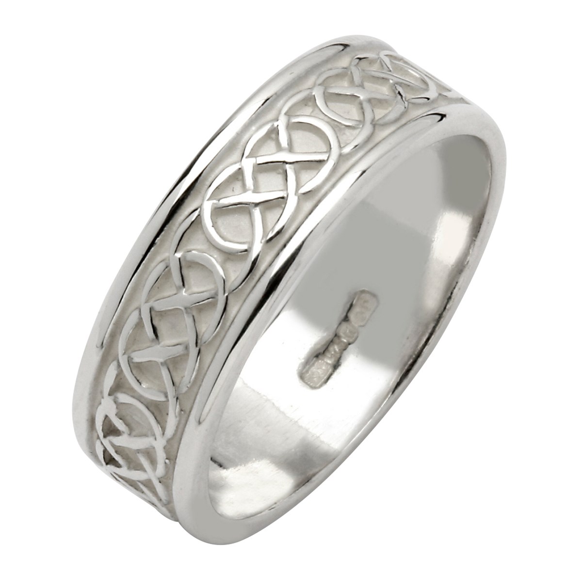 このケルト風クローズドノットのホワイトゴールド結婚指輪は、クラシックなデザインにひねりを加えたリングです。無限の結び目のモチーフがリング全体を囲み、丸みを帯びた縁取りがデザインを囲んでいます。