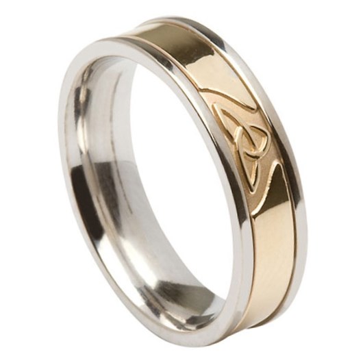 トリニティ・ノット・ホワイトゴールド・バンド(イエローゴールドのセンター)は、洗練された意味深いケルトジュエリーです。永遠の愛と精神的な成長を象徴する、熟練の職人の手によって丁寧に仕上げられています。このエレガントなリングは、幅5mmの10金または14金ホワイトゴールドのバンドと、対照的なイエローゴールドのセンターが、時代を超えた魅力を高めています。
