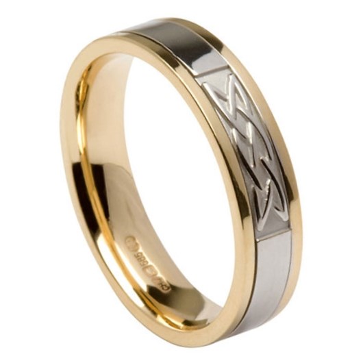 この結婚指輪はシンプルながらもエレガントで、恋人たちの結び目はホワイトゴールドで、その両側はイエローゴールドで囲まれています。ケルトの愛の結び目は、互いに切り離すことのできない、繋がり合う途切れることのない輪を表す伝統的なモチーフです。美しいだけでなく、この指輪は深いロマンチックな意味を秘めています。