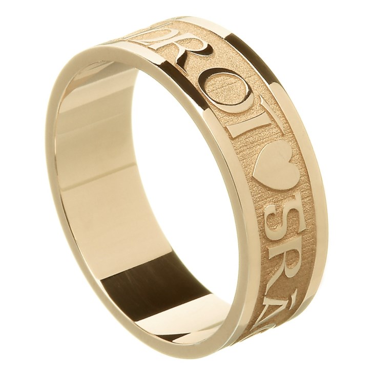 Celebrate your enduring love with the “Love Of My Heart” wedding ring, a beautifully crafted band in yellow gold that weaves together heartfelt meaning and Celtic heritage. Every curve, every symbol, is designed to reflect both personal devotion and ancient tradition.