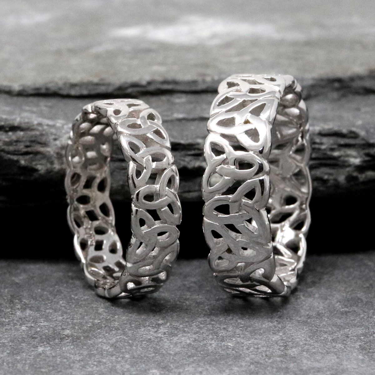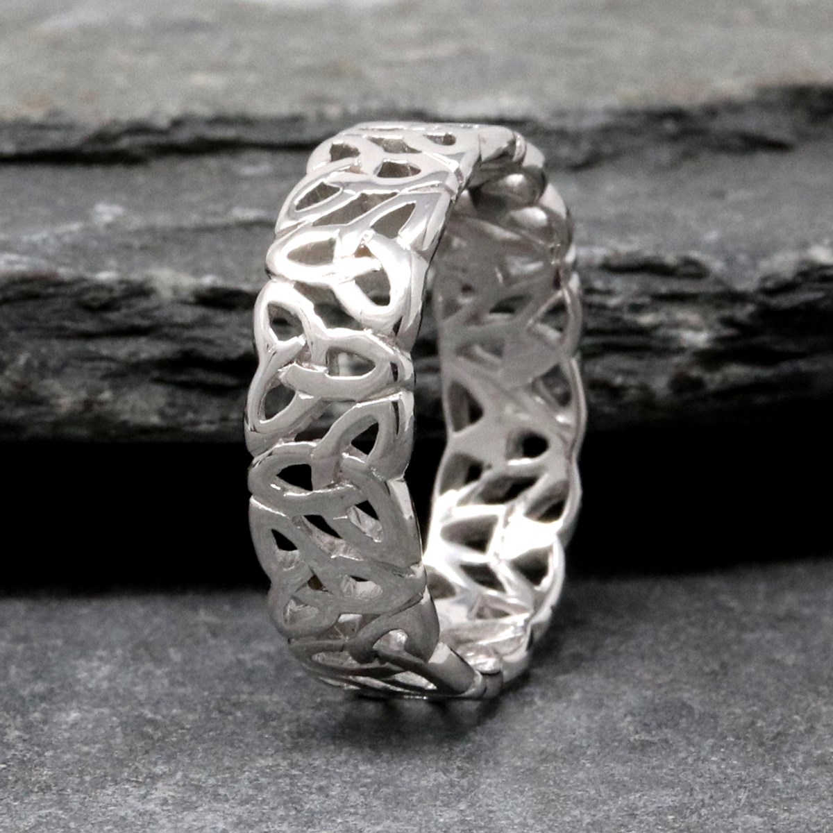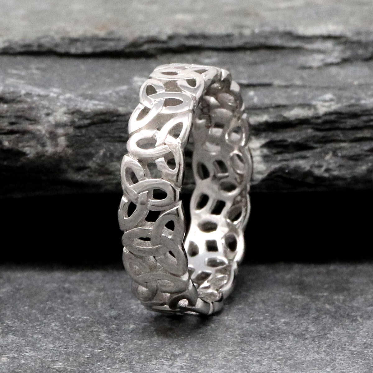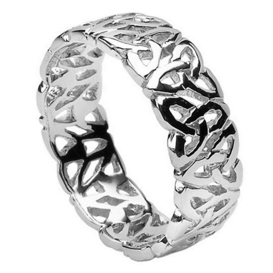 This Trinity knot silver ring has a filagree design which pierces the pattern to ensure that it stands out beautifully for the wearer. Historians trace the Celtic knot to northern Italy before it began to make its way to Ireland and these symbols can be seen in jewelry, manuscripts and monuments through the years and to this very day. This ring celebrates love and infinity, made with the best of Irish craftsmanship.