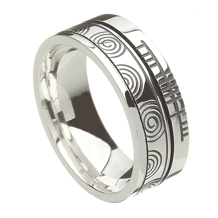 The ring is inscribed with the word 'Faith' in Ogham script, an ancient Irish alphabet.