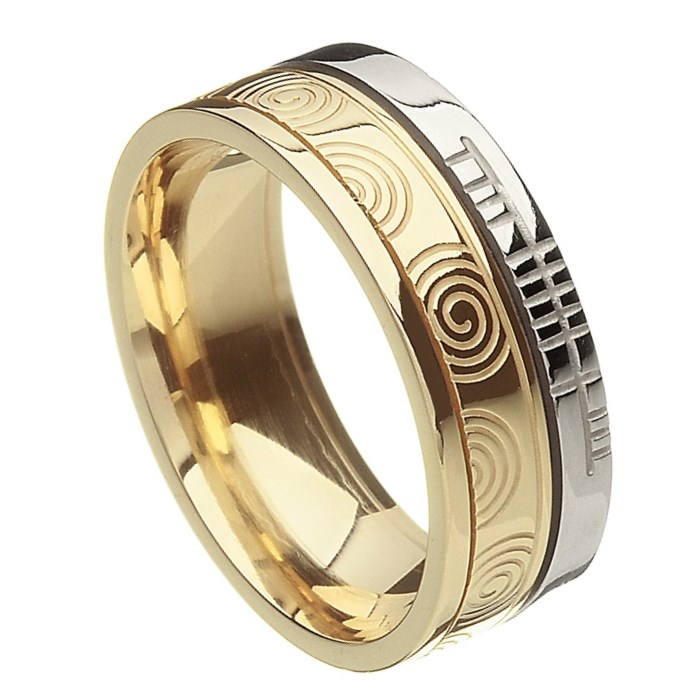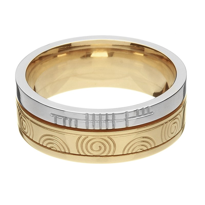 This Newgrange faith ring features detailed spirals which are a symbol of fertility and rebirth. The ring has a white rail band with the word ‘faith’ inscribed in ogham script, the ancient Irish alphabet – a beautiful sentiment in a stunning ring.