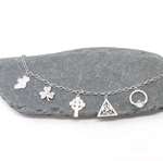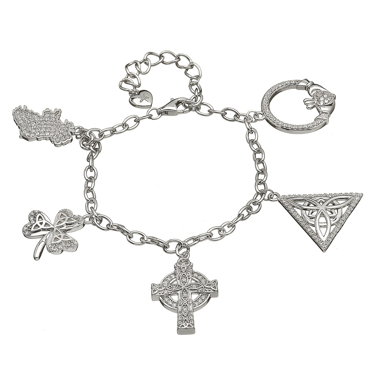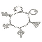 It is thought that the idea of wearing charms was a form of amulet to keep evil spirits and bad luck at bay. The selection of charms on the Irish Charm Bracelet includes a map of Ireland, a Celtic high cross, the shamrock made famous by Saint Patrick, the Trinity knot and the Claddagh symbol.