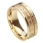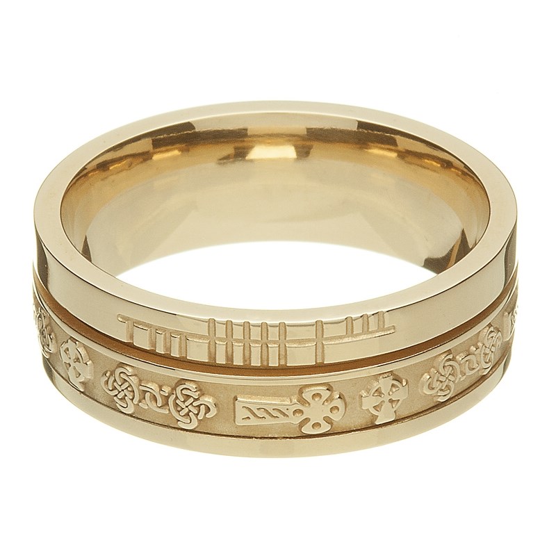 This wedding band echoes the union of two lives in marriage with its split design that features iconic Celtic symbols. On one side this stunning Celtic Cross Faith Band features ancient Celtic Cross symbols and on the other is inscribed with the word 'Faith' in Ogham script, an early Irish lettering system.