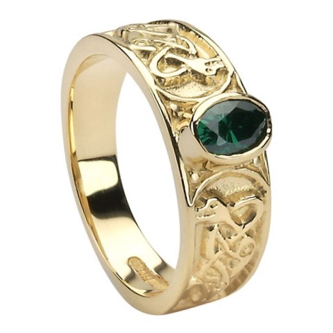 The center of the design sees an emerald mounted out proudly in an oval cut. Then the yellow gold band which is available in 10k and 14k yellow gold features very ornate Celtic knots which are one of the most famous symbols and landmarks of the island of Ireland.