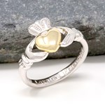 This solid sterling silver ring with 10k yellow gold heart is all the more special as it features the words ‘love’, ‘loyalty’ and ‘friendship’ inscribed on the inside of the ring. Ireland’s romantic ‘Ring of Claddagh’ originated from the Galway fishing village of Claddagh and this symbol of love, loyalty and friendship has continued around the world from the 1600s to today. This ring is made by local artisans and craft-workers here in Ireland and bears Ireland’s official hallmark from the Assay office at Dublin Castle.
