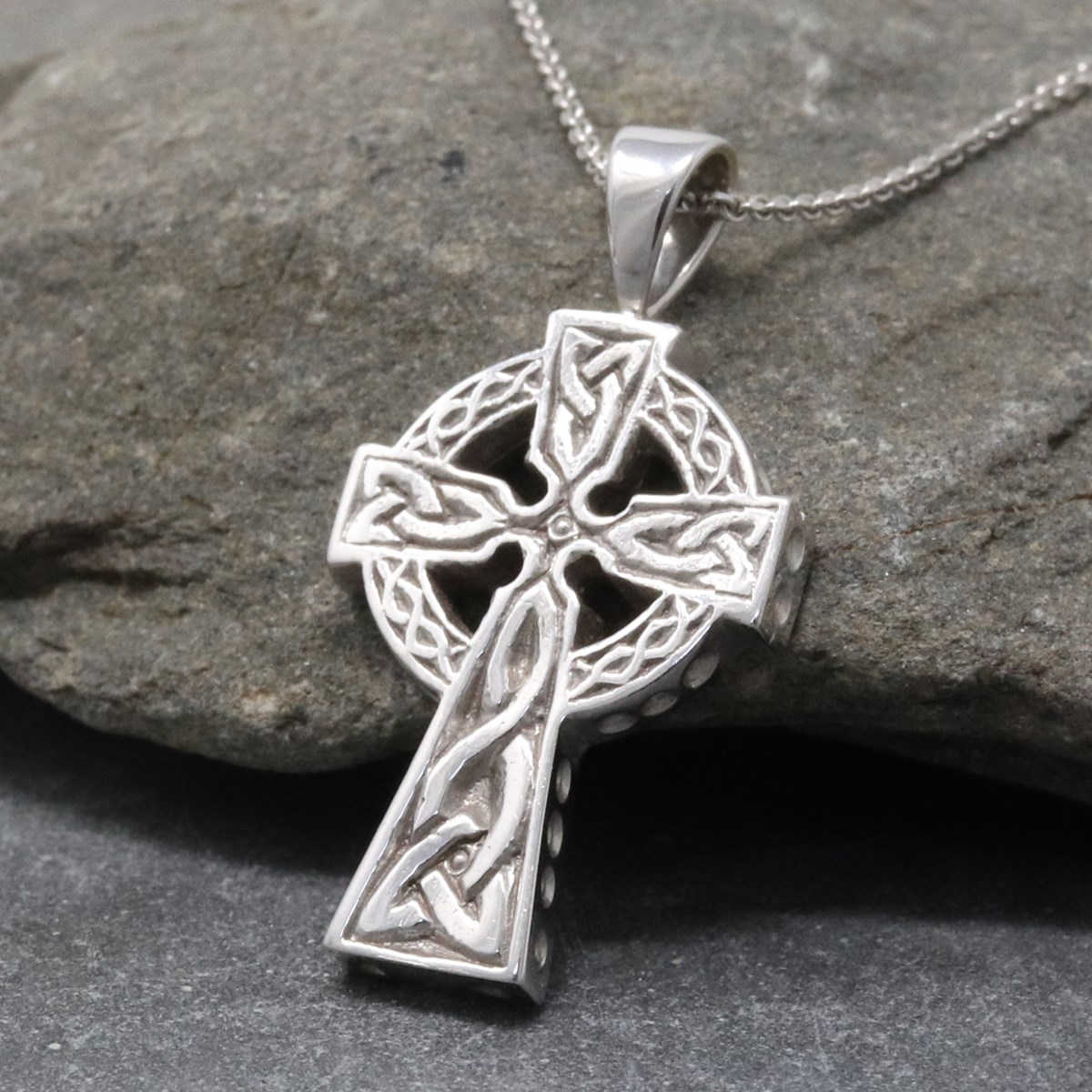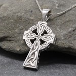 This double sided white gold Celtic Cross is a true celebration of the craft, heritage and history of Ireland. A Celtic cross is precious symbol when it comes to Ireland. These crosses are a very important part of the history of the country and this white gold necklace features engravings on both sides with stunning variations of the Trinity knot on each section with never ending knot work on the circle that intersects the cross.