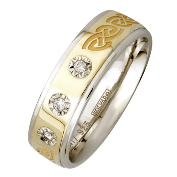 If you would like a wedding band with additional sparkle, the Celtic Knot Silver Wedding Band with Gold Center offers just that with the addition of three diamonds set in to the design. This wedding band is available in ladies and gents widths, so is a great option for those that would like to invest in a matching set of bands.