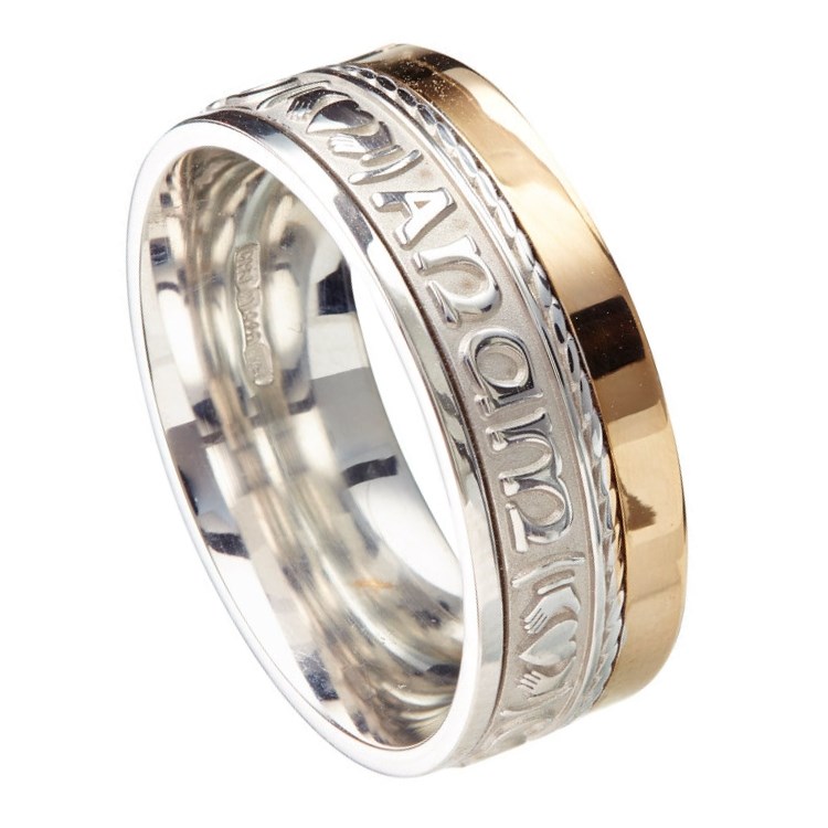 A contemporary looking, low-key ring at first glance, when you look a little further at this Celtic ring you will be struck by the detail within it. Engraved around one side is an Irish inscription 'Mo Anam Cara', which means 'My Soul Mate' and there is also a Claddagh symbol built in to the overall design, which has contrasting silver set beautifully against yellow gold.
