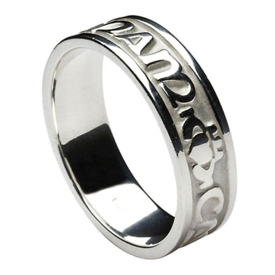 This beautiful ring has three Irish Claddagh symbols, and between each Claddagh are the Irish words 'Mo Anam Cara' (pronounced: Muh Onum Kara), which means 'My Soul Friend'.