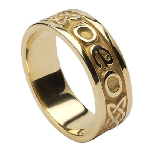 This ring is inscribed with the Irish words 'Gra Go Deo', which translates to 'Love Forever' (pronounced: Graw Gu Dee-o). Between each word is the Saint Andrew Celtic knot. This knot symbolizes the bond between two people, whether in love or friendship.