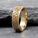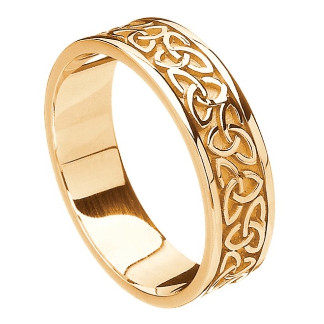 The Trinity knot is one of the best known and evocative symbols in Celtic culture. It is showcased beautifully here, featuring as the centerpiece in this stunning Trinity knot solid yellow gold band. This ring celebrates the very best of Irish and Celtic culture and craft.