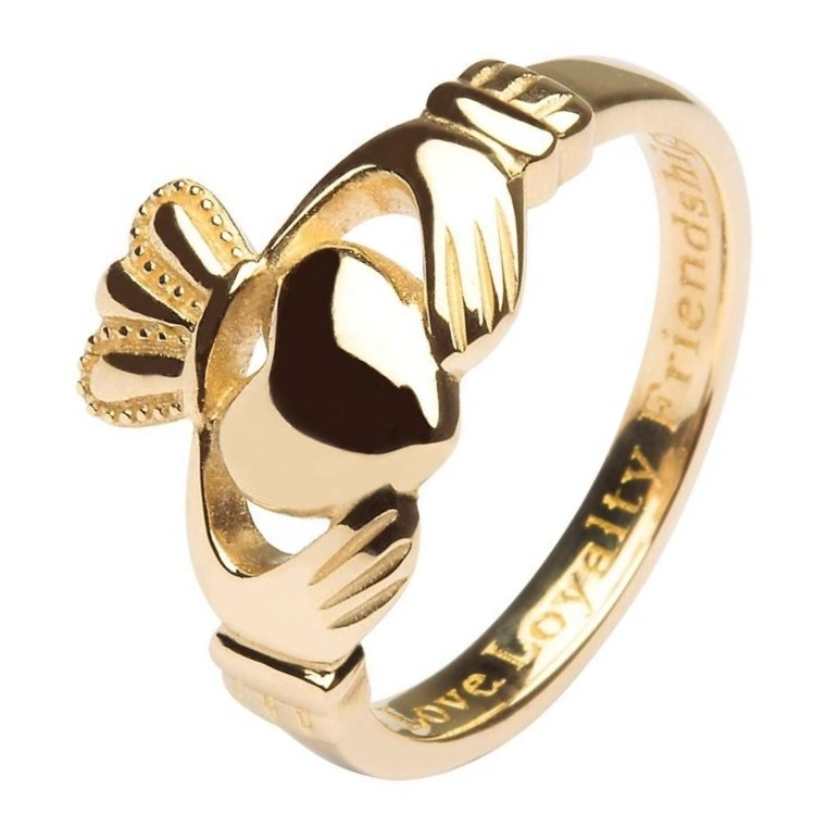 Anybody from around the world who has an interest in Celtic or Irish history will be familiar with the beautiful and romantic story of the Claddagh ring. Its message is a simple one but it has resonated strongly throughout the years and it means love, loyalty and friendship. The heart represents love, the hands friendship and the crown loyalty and these words are engraved in the center of this ladies love, loyalty and friendship yellow gold Claddagh ring so that the wearer bears this message both in visual and written form.