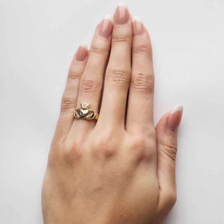 This ring is a beautiful addition to any jewelry collection and would make a wonderful gift or self gift as it is a piece that can be worn daily. The yellow gold is a traditional choice for a Claddagh and the ring can be worn in a variety of ways ranging from on the right hand with the heart facing outwards when single and unavailable; on the right hand with the heart facing inwards if in a relationship and on the left hand on the third finger with the heart pointing outwards if the ring is chosen as an engagement ring.