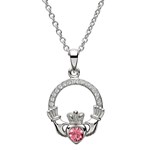 This elegant October birthstone Claddagh pendant with Pink Tourmaline cubic zirconia stone is available in solid sterling silver.