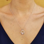 The pendant bears the traditional Claddagh design: hands to signify friendship, a heart to symbolize love, and a crown which represents loyalty.