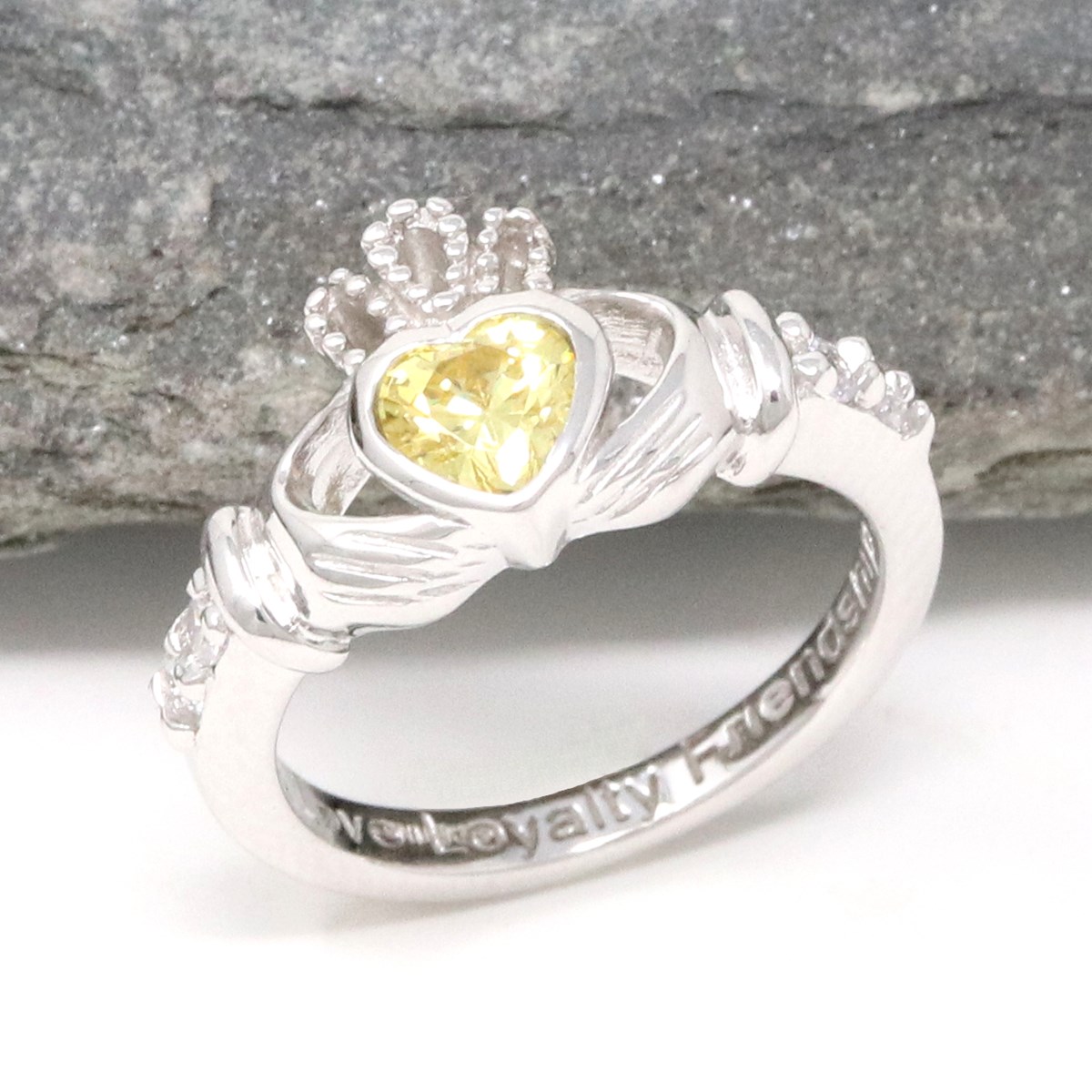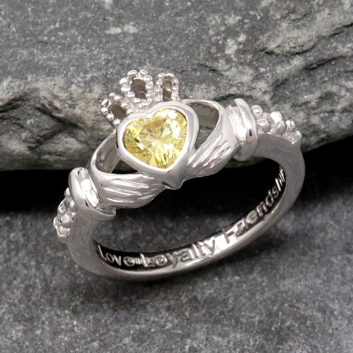 The ring is inscribed on the inside with the words "Love", "Loyalty" and "Friendship", which refer to the heart, crown and hands of the Claddagh symbol.