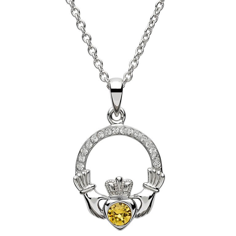 This elegant November birthstone Claddagh pendant with Citrine cubic zirconia stone is available in solid sterling silver.