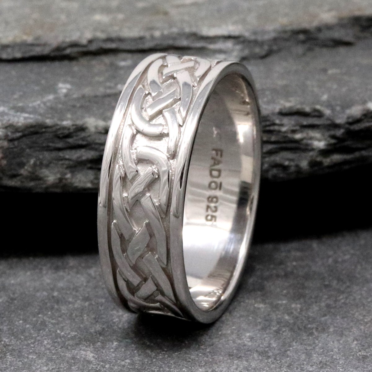 Celtic knots have been used for celebration and decoration extensively in the Celtic style of insular art and can be seen in jewelry, manuscripts and monuments through the years. The Celtic knot shines out especially well in this solid silver background and is a perfect choice to celebrate marriage, either as a single ring or as one of a pair.