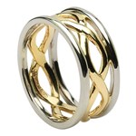 This infinity weave ring with trim is a showstopper. The combination of yellow gold with white gold trim brings two materials together beautifully and the contrast is remarkable. The infinity weave pattern adds further interest and creates a stunning effect.